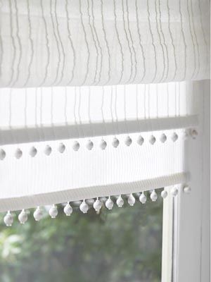 Lo bueno de esta idea es que es una cosa muy simple pero que puede tener resultados muy diferentes. Por ejemplo, puedo poner una guirnalda en un color muy clarito, con un remate en un color parecido al tono de tu cortina, como estos ejemplos de cortinas muy finas en blanco.