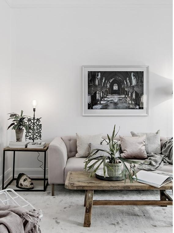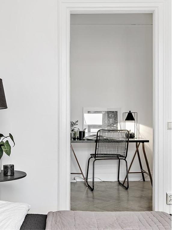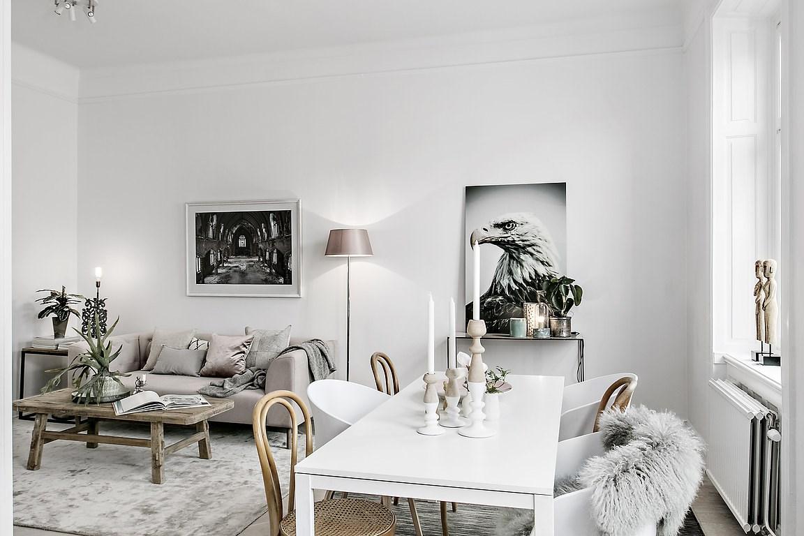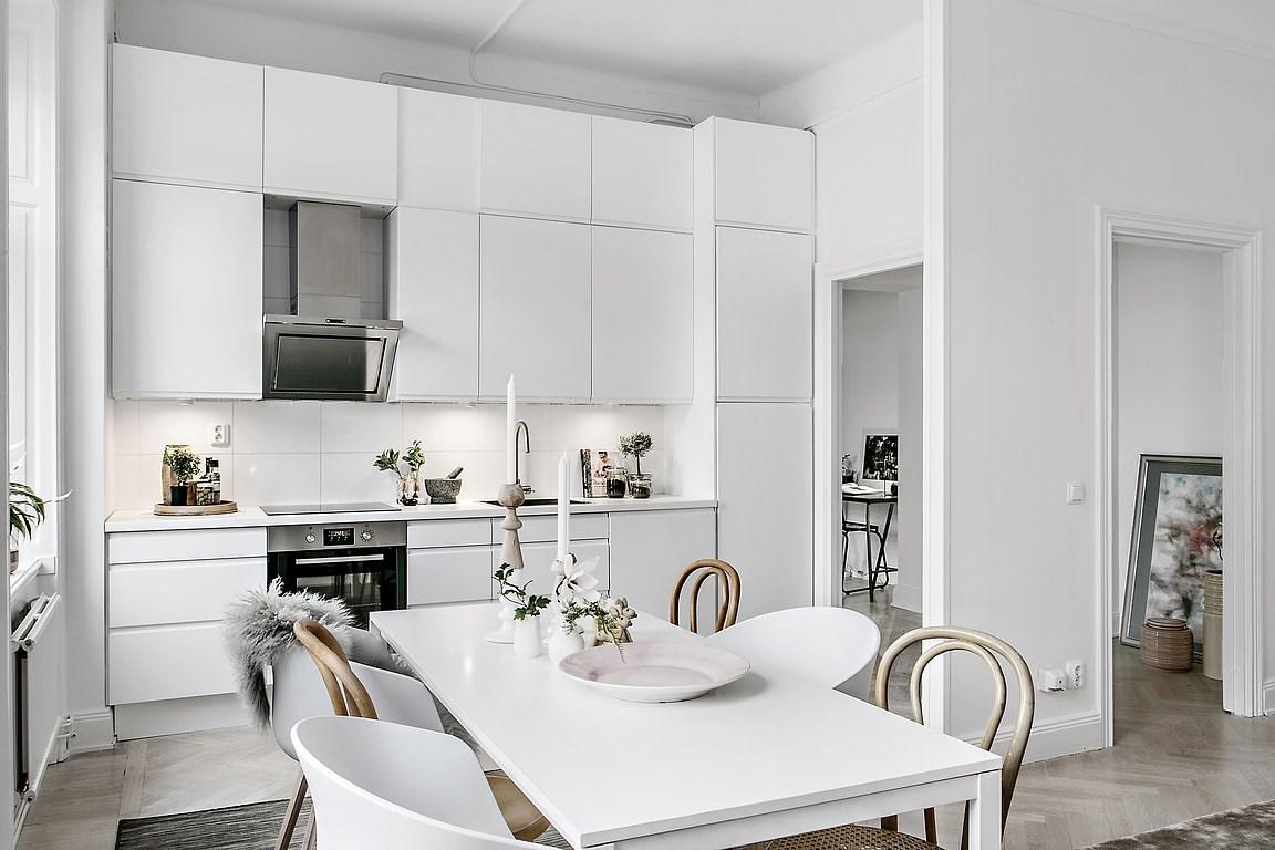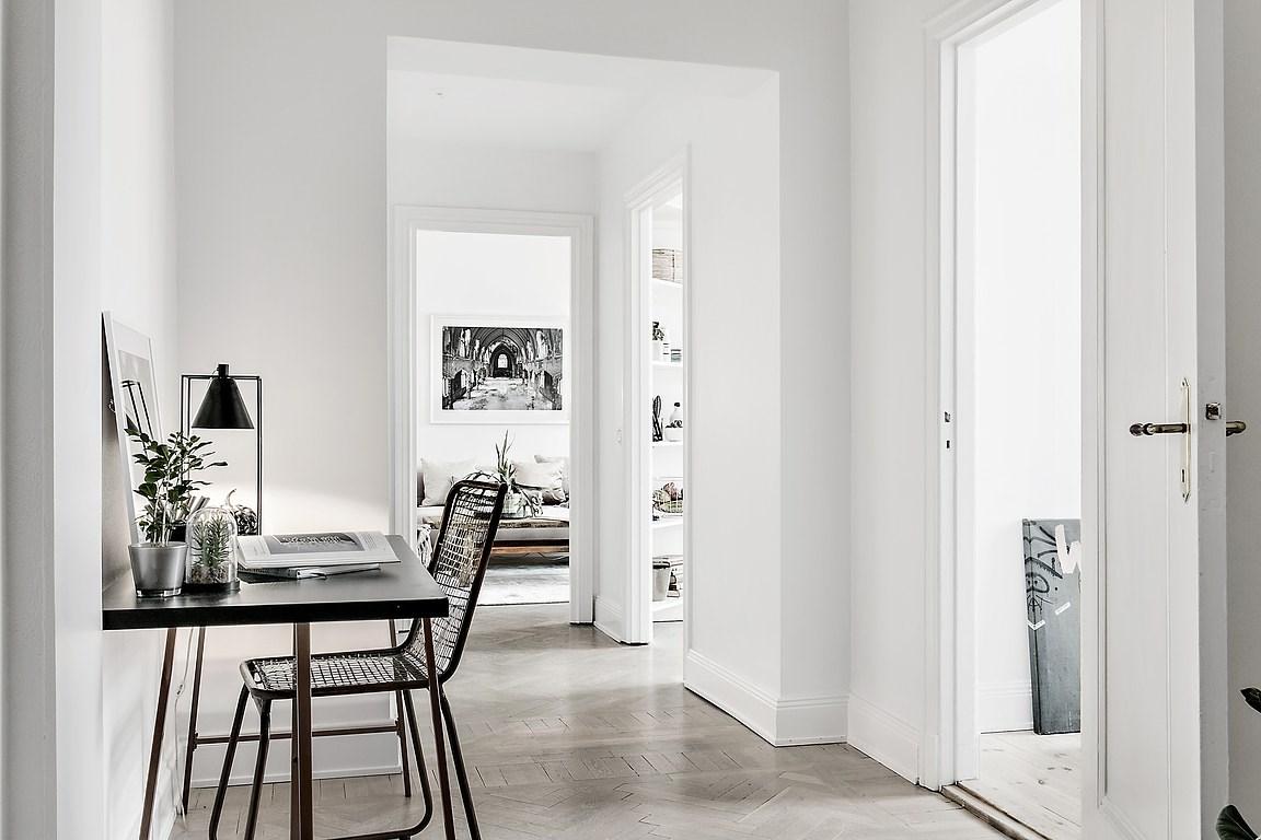 En este apartamento, el blanco agranda visualmente el espacio que no cuenta con muchos metros cuadrados. Si no lo hubieran combinado o acentuado con otro color, la sensación de vacío sería mayor. Por eso con las plantas y flores, y el uso de la madera clara, se da una sensación de frescor y calma increíble. Además, con este color de base, se consigue realzar la luz y reflejar los elementos decorativos. Utilizado en armonía, el blanco disminuye la intensidad de los colores puros, y los demás, al tomar contacto con él, parecen atenuados, creando así un cambio de ritmo en la estancia. Este tipo de paleta también refuerza la elegancia de los materiales usados.