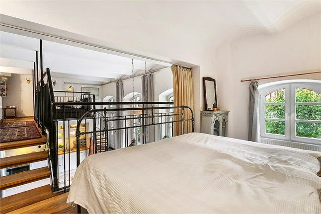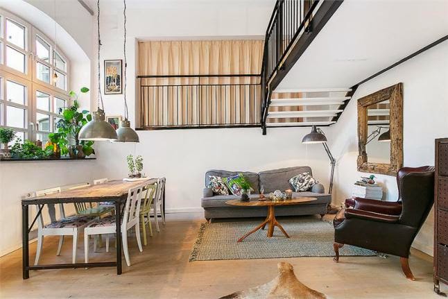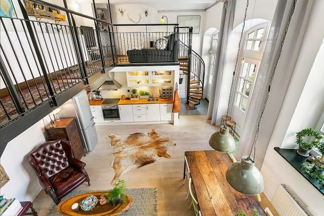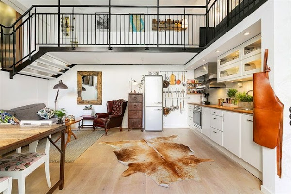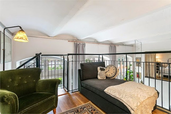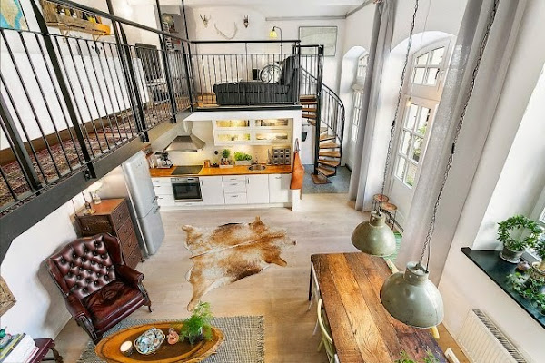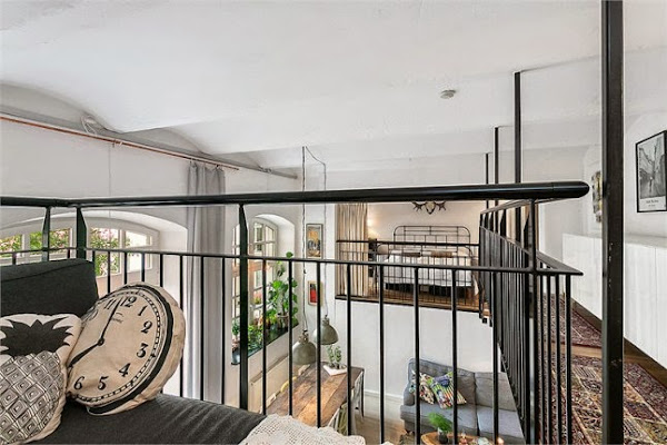 Destacan, como buen loft, sus grandes y hermosos ventanales que dejan pasar mucha luz haciendo que todo el espacio parezca mucho más grande. Una conexión de buen gusto entre materiales, texturas, colores, materiales y estilos. Me quedaría como piezas especiales el sillón orejero en cuero, la mesa de madera recuperada del comedor, las lámparas colgantes industriales en verde... Piezas vintage que aportan alma. El juego de doble altura se refuerza con la barandilla que deja abierto todo el espacio de la planta altillo donde se desarrolla la zona de dormir, y que no invade toda la planta.