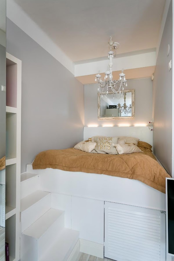 La zona de dormitorio se sitúa en altura a modo de altillo pero abierto al resto de la vivienda, jugando con la zona de escalones para almacenamiento y aprovechamiento. El espejo de una de las piertas del armario, crea sensación de amplitud. En el baño la paleta de colores blanco y negro tiene un acabado de rejilla como los textiles.