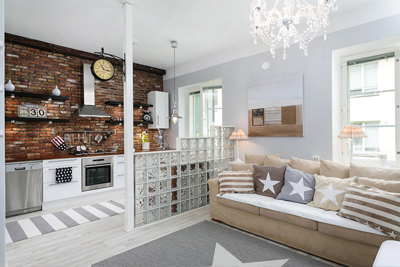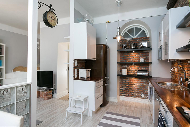 Este apartamento compacto de reducidas dimensiones que constaba de dos habitaciones originalmente, experimentó un cambio de imagen total para ser transformado en un sólo espacio social abierto y comunicado entre sí. La pared de ladrillo a modo de frontal de la parte superior de cocina en contraste con la encimera de madera de color marrón, da una agradable sensación de calidez al espacio de paleta de base en blanco, y al mismo tiempo se crea la perfecta unión de los detalles rústicos de los materiales, y los utensilios de cocina de acero. Una preciosa combinación que crea un ambiente único y confortable, en tan sólo 42 m² de espacio habitable. La zona de estar se divide a media altura por un muro de vidrio pavés con la cocina. Los muebles colgados en blanco a ambos lados de la cocina añaden espacio de almacenamiento adicional y, a su vez, aligeran las paredes de ladrillo que crean agradables sombras con los estantes abiertos tipo baldas, que no son sólo prácticas, sino que también dan un aspecto desenfadado a todo el espacio.