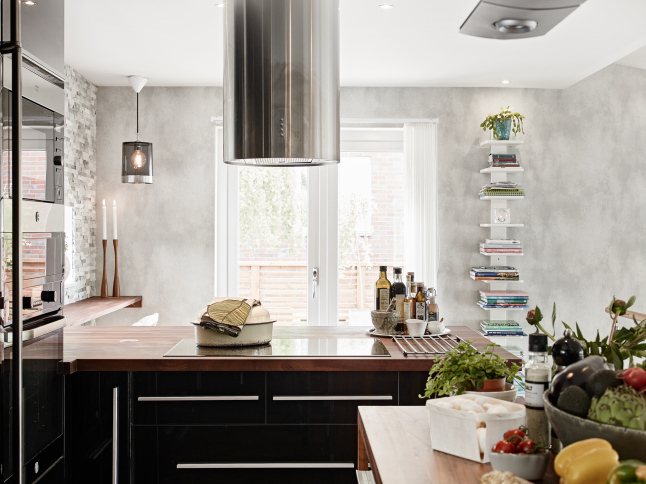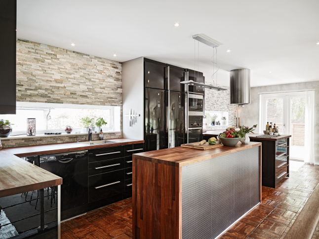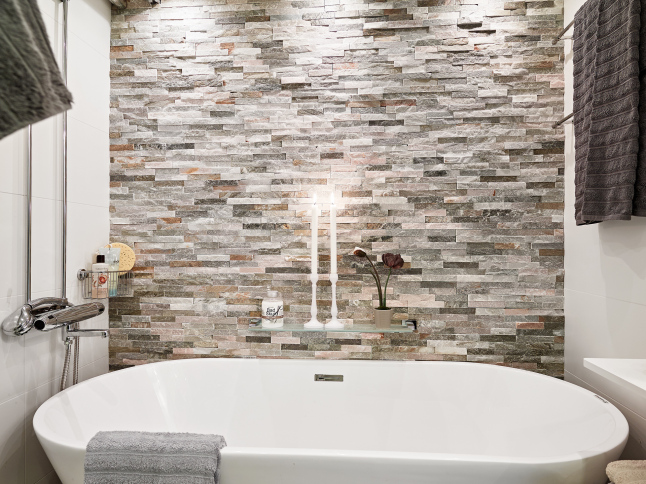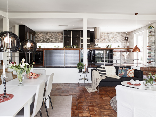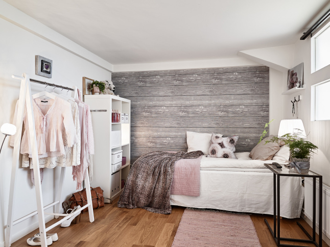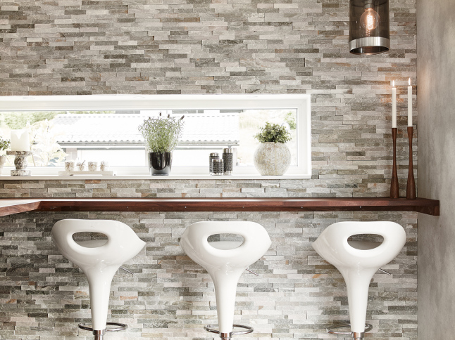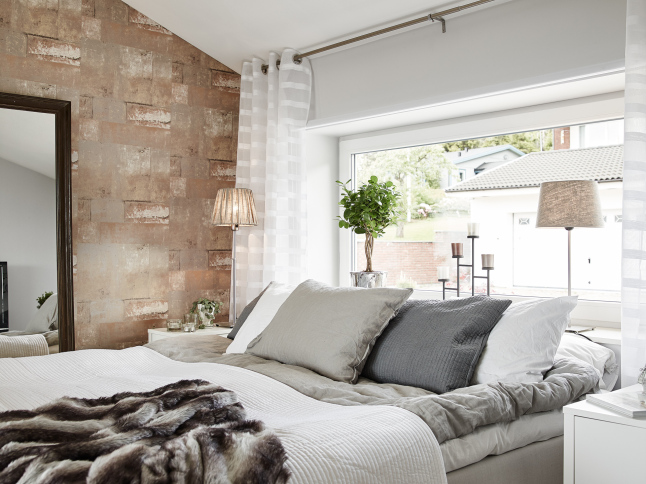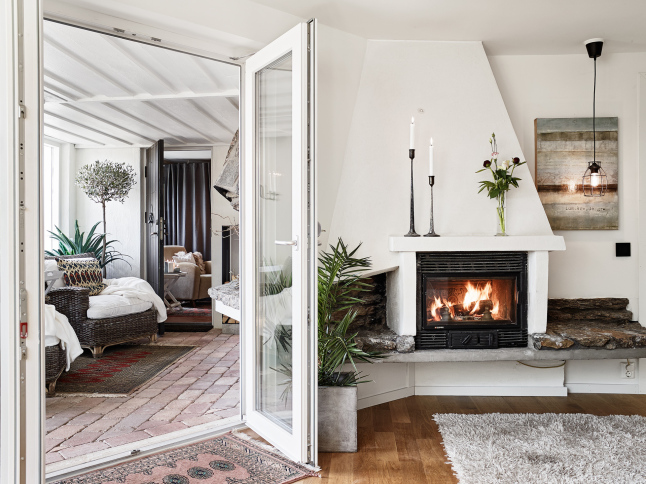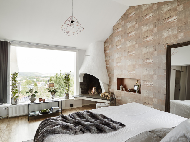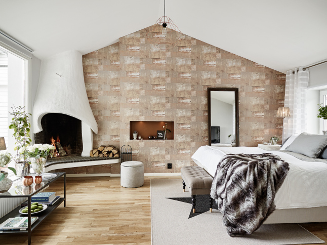 La pared de piedra en la zona de cocina y el uso de madera oscura en solados y algunas piezas de mobiliario le aportan el punto rústico perfecto junto con las chimeneas. Es como una especie de refugio sofisticado de invierno. Todo el frente de trabajo de la cocina no sólo cuenta con el revestimiento de piedra en listones de pequeño formato, también cuenta con una abertura a modo de ventana rasgada a lo largo de la pared que permite la entrada de luz. En el dormitorio se ha utilizado un papel a modo revestimiento de ladrillo que lo imita y que le aporta calidez, rusticidad y mucha personalidad.