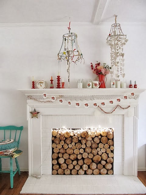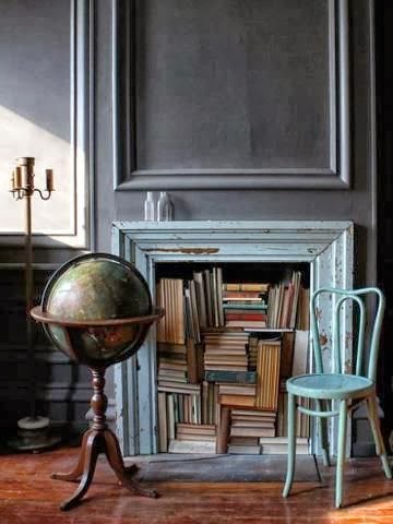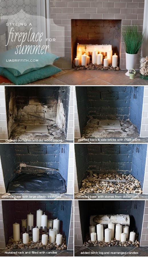 En este caso el desorden es intencionado. Pero si este "caos" no va con vosotros, se pueden poner dos baldas y crear un espacio muy especial que podemos utilizar como mini biblioteca, o para llenar con objetos curiosos, candelabros diferentes (podéis ver nuestro post aquí), velas de distintos tamaños... Este tutorial de liagriffith.com nos enseña como darle uso a la chimenea en verano, pero podemos coger la idea para chimeneas antiguas que estén en desuso: