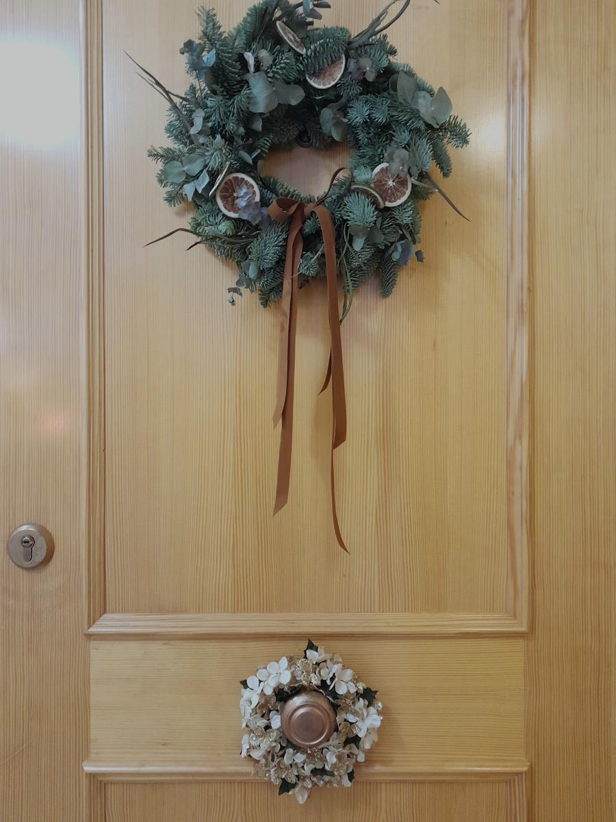 Empezando por la puerta principal, donde he colgado la corona natural que hice en un taller de @absolutaflora