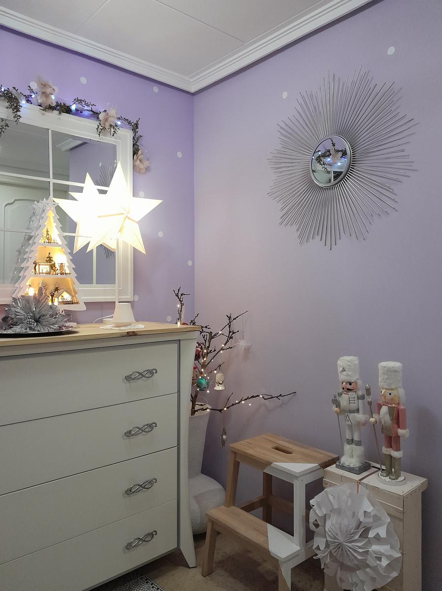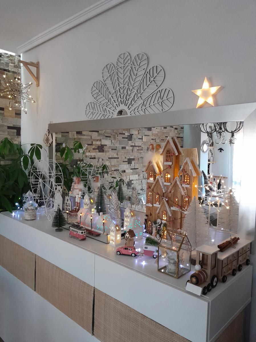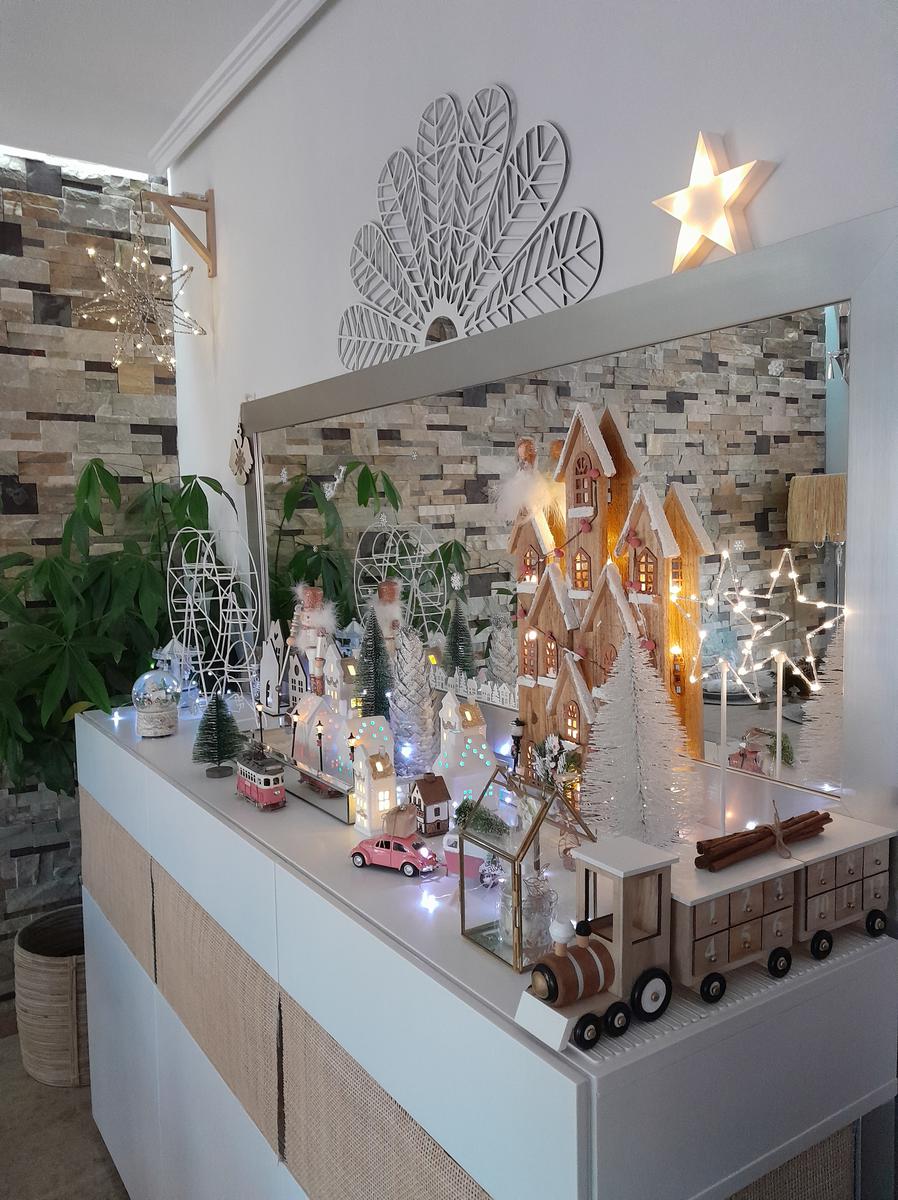 Y como colofón, sobre la cómoda está mi última adquisición: un árbol/pueblo navideño que he puesto junto a la lámpara estrella .