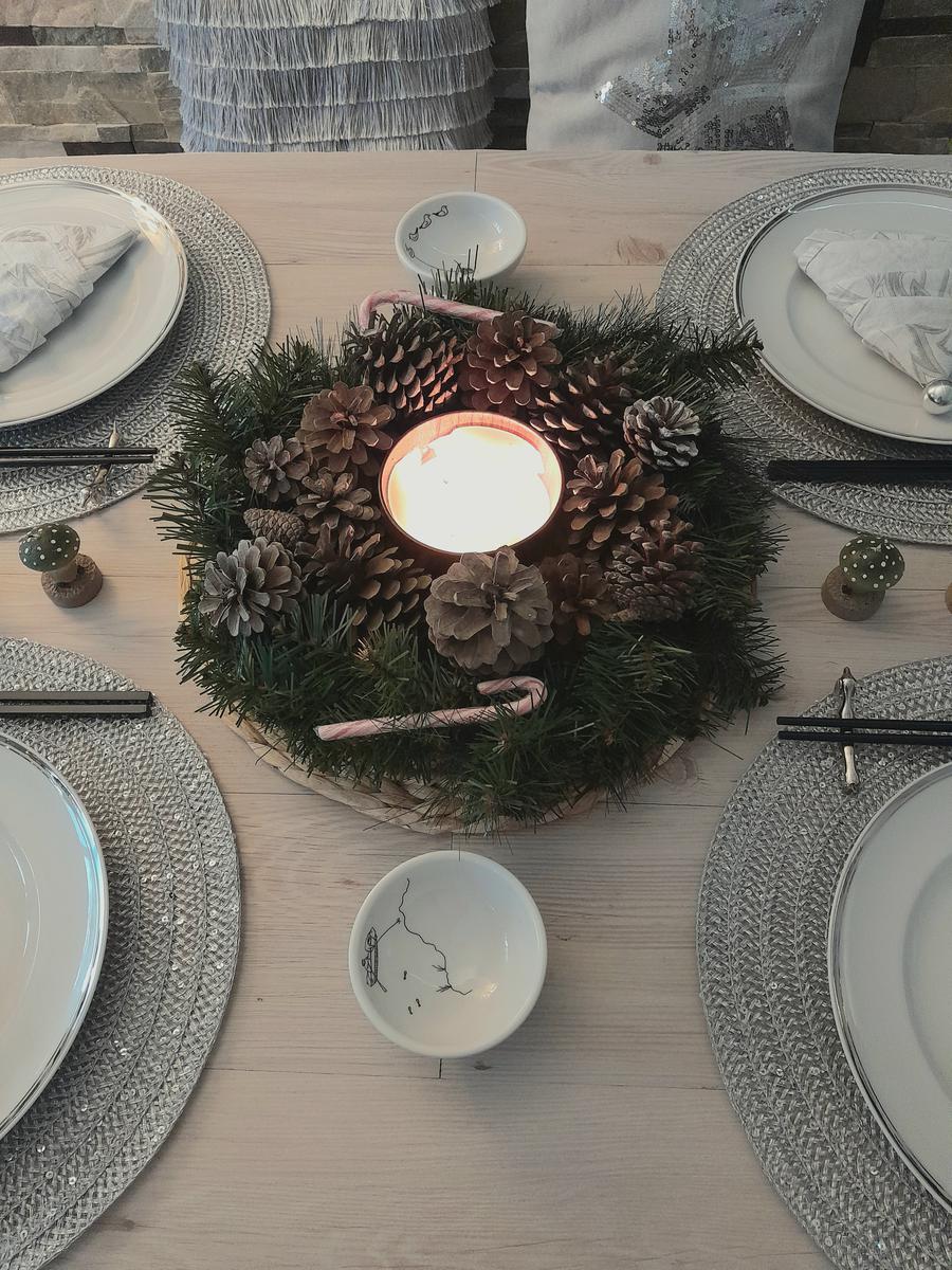 Con una corona de Ikea que encontré rebajada, una vela de 3 mechas de @maisonsdumonde_es que huele super bien y que me regaló mi , unas piñas cogidas del campo, un par de bastoncillos reutilizados de regalos y una pizca de purpurina, tenemos un centro de mesa barato barato .