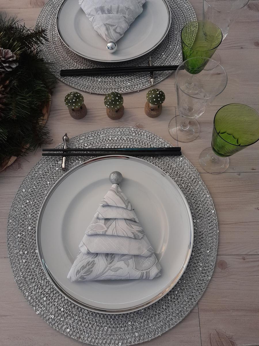 Los palillos chinos y los reposacubiertos de perro salchicha, son de @zarahome de hace tiempo. También los salvamanteles y las servilletas que he doblado en forma de árbol de Navidad , coronado con una bolita que se puede utilizar para poner el nombre de la persona que se siente a la mesa y que luego se la lleve de recuerdo .