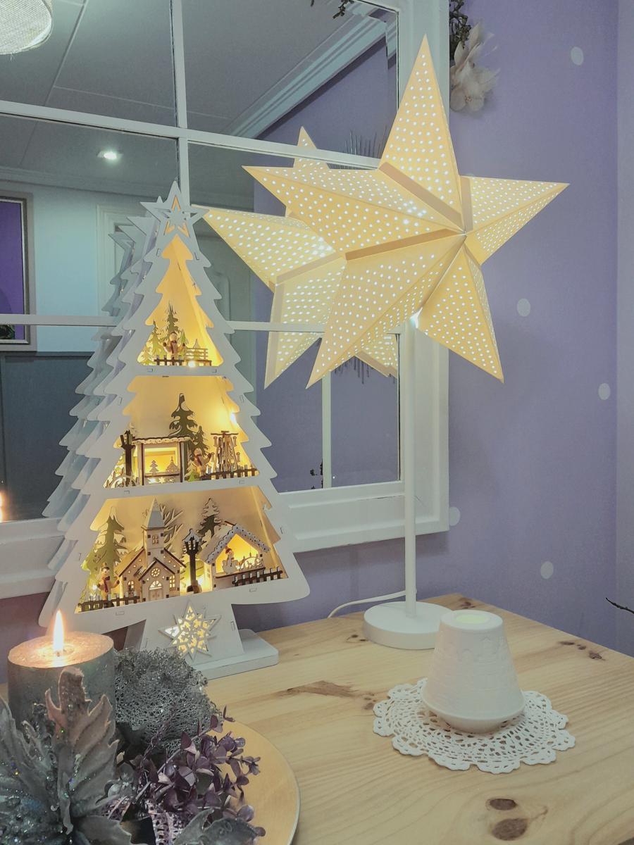 En la esquina tengo todo el año una rama que cogí del campo y le enrollé una tira led. De ahí colgamos las bolas y adornos que compramos en nuestros viajes navideños. Este año la novedad es la estrella blanca que veíamos por todos lados en Berlín