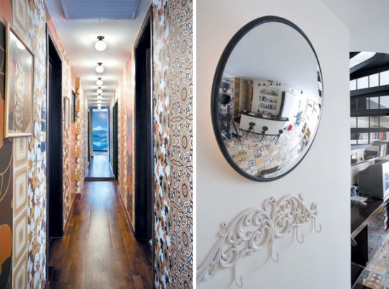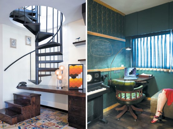 Este apartamento dúplex tiene un área total de 160 metros cuadrados y diseñados de manera muy creativa y personal. En la primera planta se encuentra la entrada, la cocina, la sala de estar y el dormitorio. En segunda los dormitorios, a los que se accede por un largo pasillo.