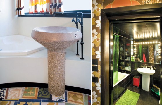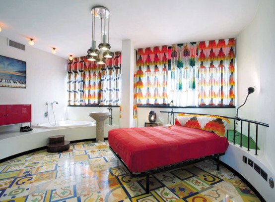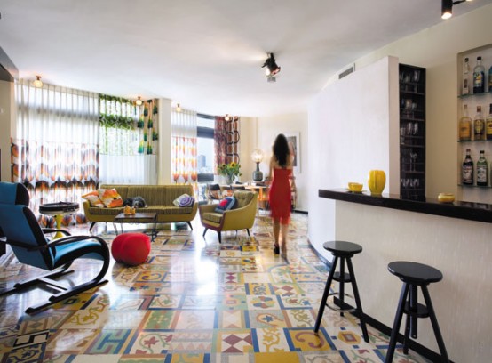 El colorido pavimento consiste en baldosas al azar, lo que proporciona una importante contribución al diseño. El resto lo hacen los muebles retro y los múltiples accesorios que le dan el toque "vintage".
