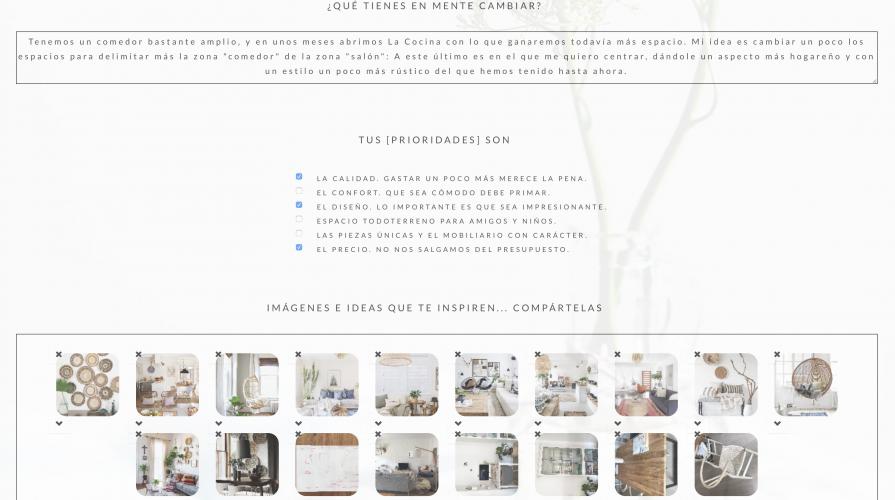Una vez tienes escogido a tu decorador debes rellanar unos cuestionarios para hacerle saber qué es lo que buscas. Para ellos haces una moodboard (tableros de inspiración), es decir, creas tu propio tablero Pinterest con ideas que hayas visto y te gusten. Ellos te proponen algunos pero puedes añadir a su web las fotos que tu quieras. También escoges colores, materiales, texturas, ambientes… y al final creas un espacio con todo aquello que quieres que forme parte de tu futuro espacio.