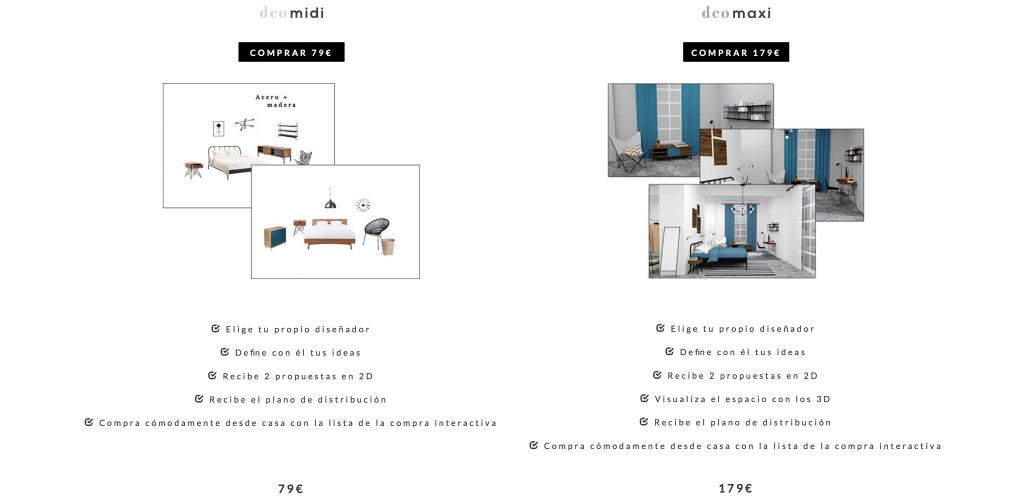 A partir de ahí empiezas a hablar con tu decorador a través del chat de la web y te va indicando los pasos que va siguiendo tu proyecto. Hay dos tipos de tarifas según la cantidad de material que quieras recibir de tu proyecto. Puedes escoger entre el Pack de 79€ o 179€. Aquí abajo os detallo lo que incluye cada Pack, pero como podéis comprobar no son precios disparados ni desorbitados.