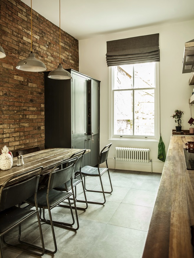 En esta cocina, tanto los muebles como los electrodomésticos se concentraron en un frente para reservar la otra pared para el comedor. El frente de la zona de trabajo agua y cocción, se revistió con azulejos blancos tipo "subway tiles", ideal para este tipo de cocinas rústicas, y para la del comedor se desubrió el ladrillo visto, dándole un aire industrial en combinación con el mobiliario. Este juego de materiales logra que los dos ambientes queden visualmente delimitados. A destacar las baldas de madera de abedul a modo de estanterías vistas con todo el encanto de las antiguas cocinas vintage. Otro de los detalles maravillosos de esta cocina es el fregadero encastrado en la encimera.