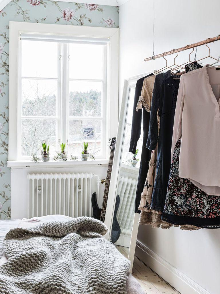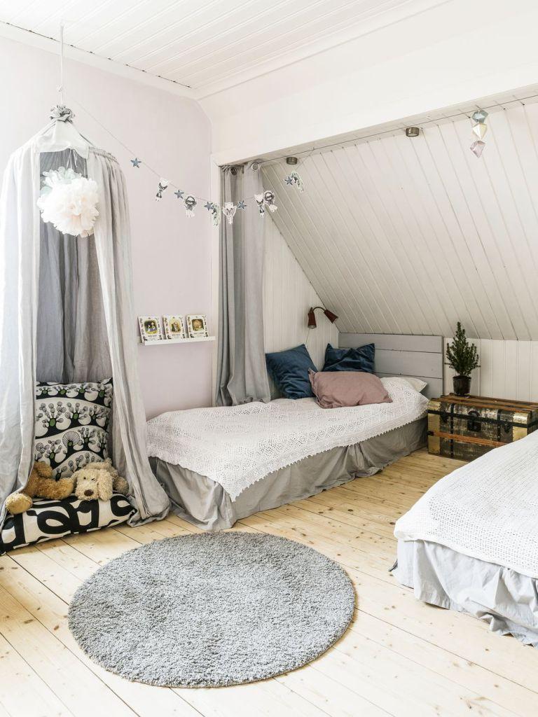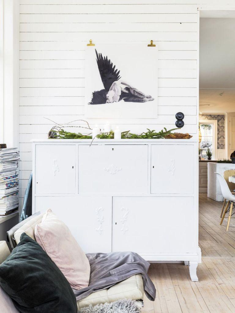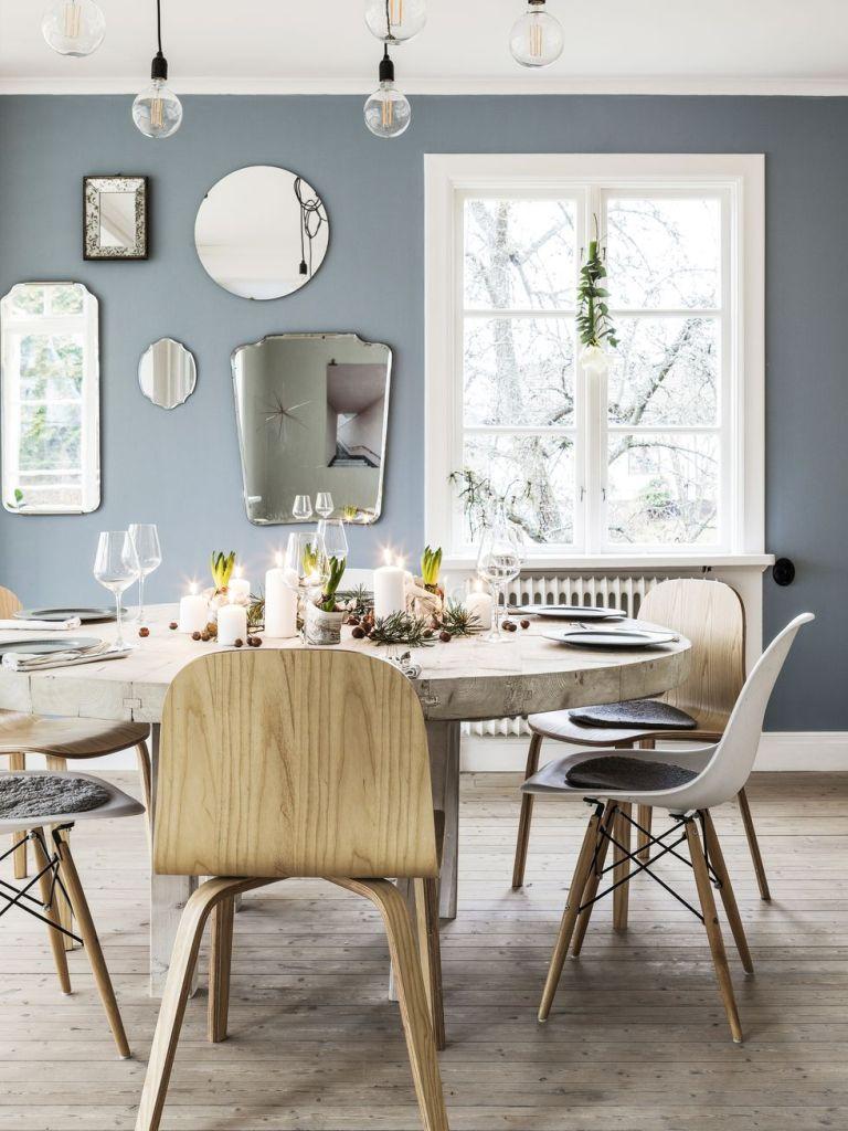Muchas de las piezas de mobiliario se han recuperado, dándoles una nueva vida y aspecto, para crear este interior. La mesa es otro de los puntos fuertes de la decoración navideña, diseñada a partir de velas, piñones y nueces. Los jacintos han sido envueltos en papel de periódico, dándole un tono natural y rústico. Otto ha construido la gran mesa de comedor de las tablas sobrantes del solado. Espejos y sillas “DSW”, diseño Charles & Ray Eames, se compran de segunda mano, y la vajilla es de Villeroy y Boch. La iluminación del techo consiste en bombillas grandes, a modo de gotas que caen del techo. Al tener soluciones de plan abierto y mobiliario simple, la sensación espacial es mayor, unida a la paleta de colores suaves y claros. Se han mantenido las piezas originales en la renovación , preservando así el carácter original de la casa (como suelos, ventanas, puertas,etc). Jugar con papel pintado en la cocina, azulejo tipo metro, y los elementos en madera, así como los techos abuhardillados en dormitorios, aporta carácter y calidez a todo el conjunto.