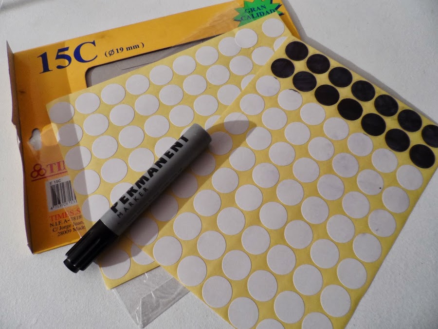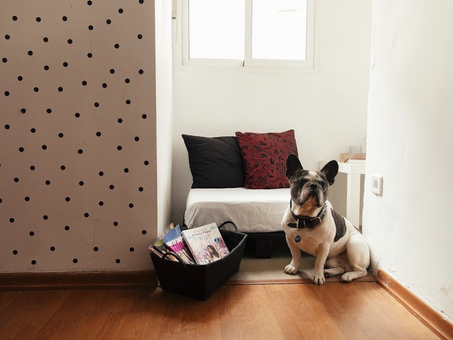 Para decorar la pared, decidí hacer la pared de lunares que esta tan de moda, no es nada difícil, solo tenéis que comprar gomets negros, en mi caso como no encontraba me toco comprar unos blanco en el bazar chino y pintarlos con permanente negro, pero quedan muy bien, no se nota que están pintados.