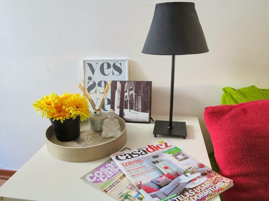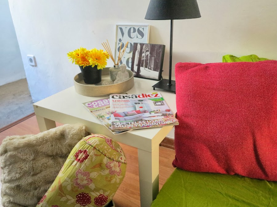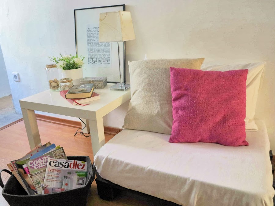 ¿Qué os parece el resultado? Para la decoración he añadido una cesta, para guardar revistas, libros...y al lado del silloncito una mesa (ya estaba en el piso) donde colocar la lámpara y las compritas que compre el mes pasado en Casa Home y me encantan.