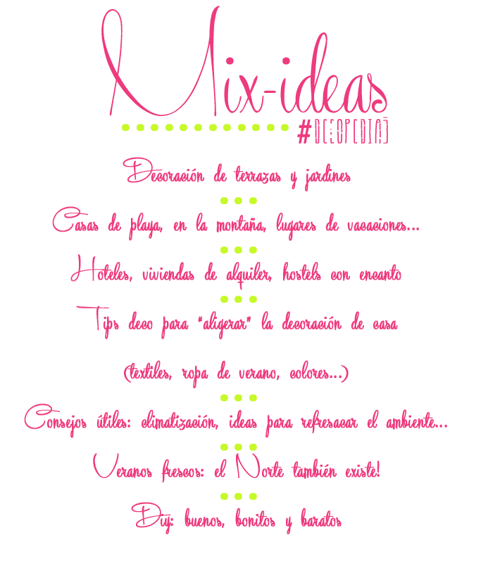 Pensando y dándole vueltas al tema (teniendo también muy presente las sugerencias que muchos habéis dejado en el último cuestionario y otras que nos han llegado por mail), la #decopedia5 está dedicado al buen tiempo. Al sol, al calor, a la vida fuera y dentro de la casa cuando llega la etapa más calurosa del año. El sol ya está aquí (en el Norte a ratos, pero aparece de vez en cuando, que es lo que importa!) y vamos a preparar nuestras casas para el buen tiempo. Bloggers DECO, #decopedia5 a topeeeeeeeeee!!