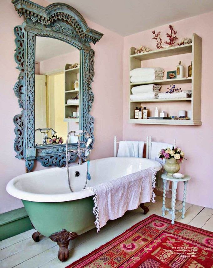 Con este espejo rococó lo que se consigue es llenar toda la habitación, que pasa de baño a gran baño. Esta pintado de azul turquesa y es atrevido.