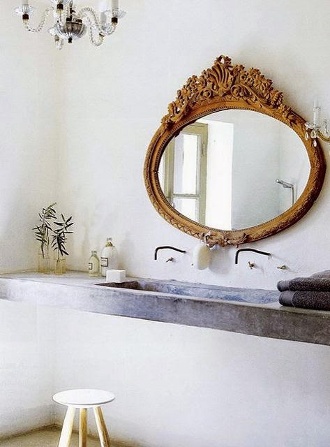 En es lavabo se coloco un espejo ovalado de madera natural, la mezcla del lavabo de piedra corrido con lo vintage del espejo me parece impresionante, el espejo refleja la ventana y aporta luminosidad a la estancia. Fijaros en los grifos de caño que unifican al espejo con el lavabo.