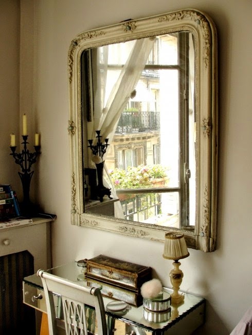 Aquí se coloco un espejo estilo Luis XV pintado de blanco antiguo y envejecido, esta colocado en una pared que refleja el exterior de la vivienda, fíjate en el efecto óptico que crea, duplica la luz y da más amplitud, esta situado sobre un tocador forrado de espejo con pequeños detalles decorativos, la cajita antigua, la lamparita de alabastro con pantalla plisada, cajita redonda de espejo, el conjunto brilla por si solo.