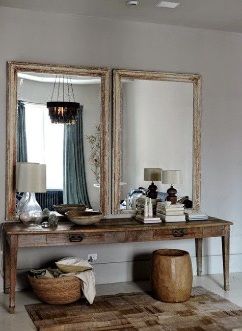 Colocar dos espejos simétricos rectangulares y grandes dan un ambiente muy equilibrado y crean sensación de orden y armonía, pero además, como están colocados frente a las ventanas potencian la luz natural y el color. Se sitúan sobre una larga mesa de madera natural con dos cajones, bajo la mesa se colocaron unos cestos, cojines, alfombra, sobre la mesa todos los objetos se duplican. ¿os gusta?