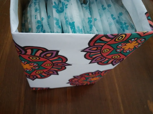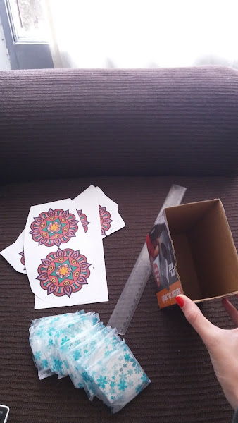 Pegamos una hoja de papel del color que querramos sobre la caja y sobre el pegaremos nuestros mandalas! Y listo!! nada más facil!!