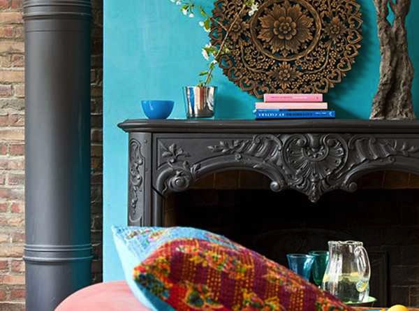 Una pared pintada en color turquesa, destaca todos los colores rosas y rojos, sin hacer la habitación excesivamente oscura.