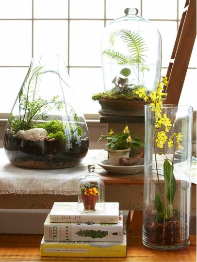 Mezclar plantas con cristal, por ejemplo, creando pequeños invernaderos para tus helechos, contribuye a la mezcla de texturas. Utiliza lámparas y jarrones de cristal.Colócalos sobre una mesa de madera.