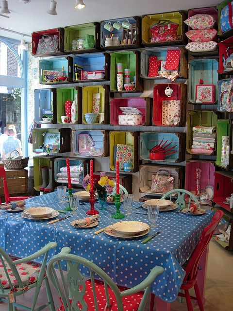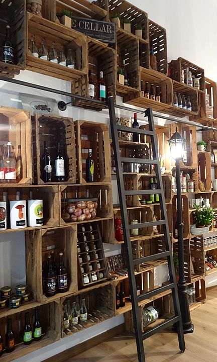 Seguro que en el último año has entrado en un local de tu ciudad que está completamente decorado con estas cajas. Como os dije al principio del post están de moda y dado que se les puede dar muchos usos diferentes y en todos sitios cumple, los decoradores de comercios han visto en las cajas de madera una mina de oro en la decoración. Lo he visto en abacerías y tiendas de comestibles. Una como botellero y en otra como estanterías. Pero como podéis ver en todos los ejemplos que os traigo, las cajas de madera no son un simple ejemplo de decoración, es un mobiliario práctico que además decora a la perfección.
