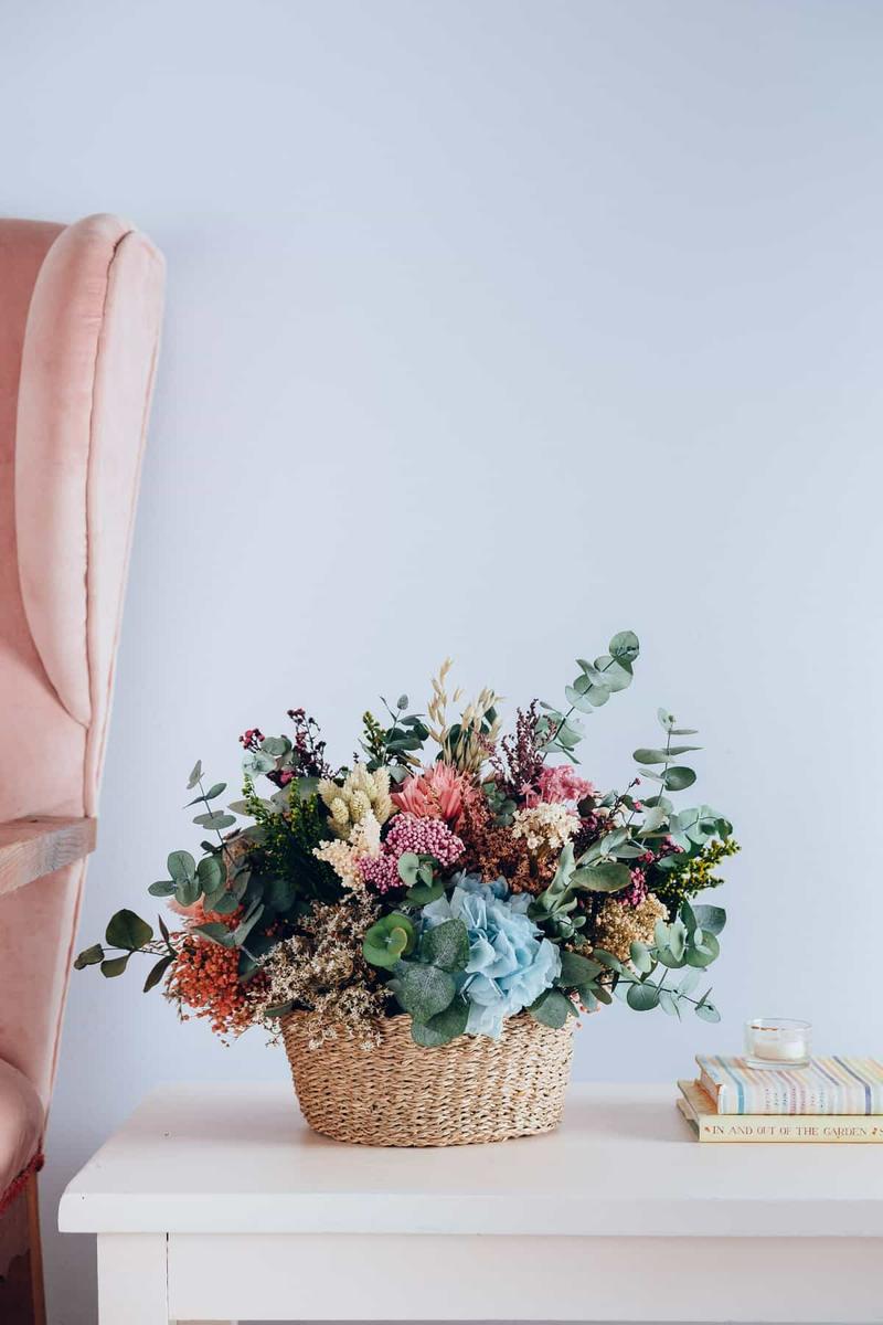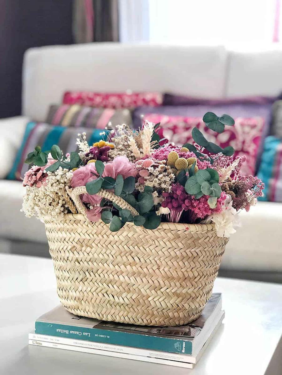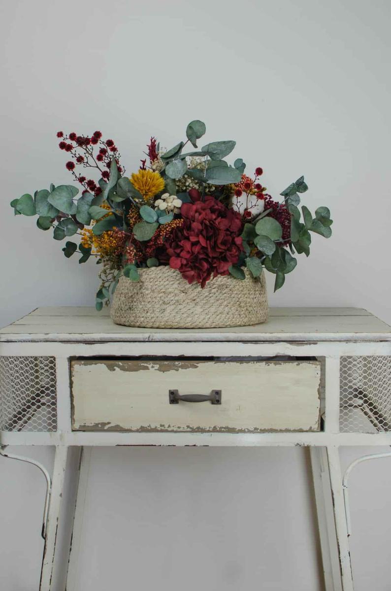Fuente: floresenelcolumpio Las flores preservadas quedan genial con jarrones antiguas de barro o de latón. Otra solución son los cestos de fibras naturales y de mimbre.