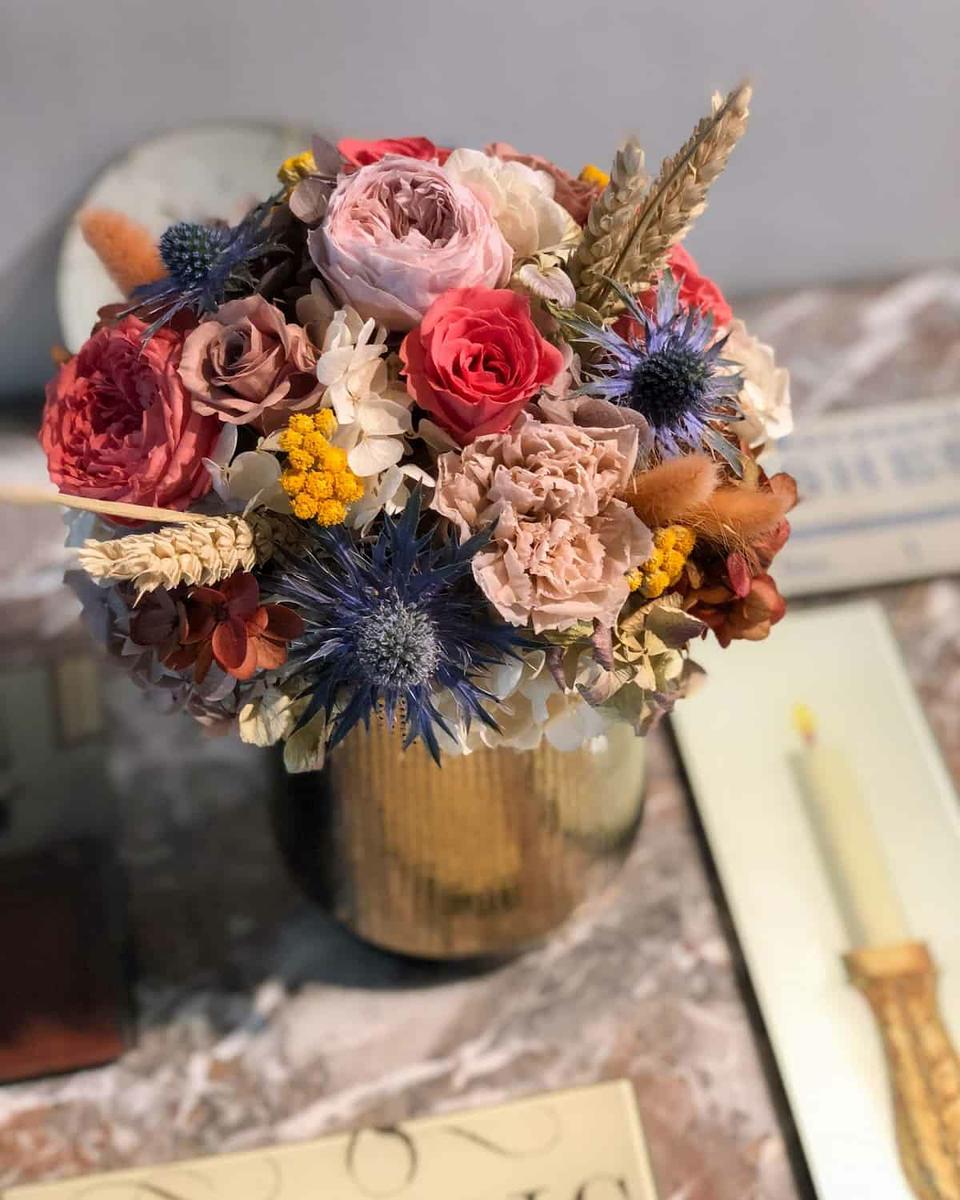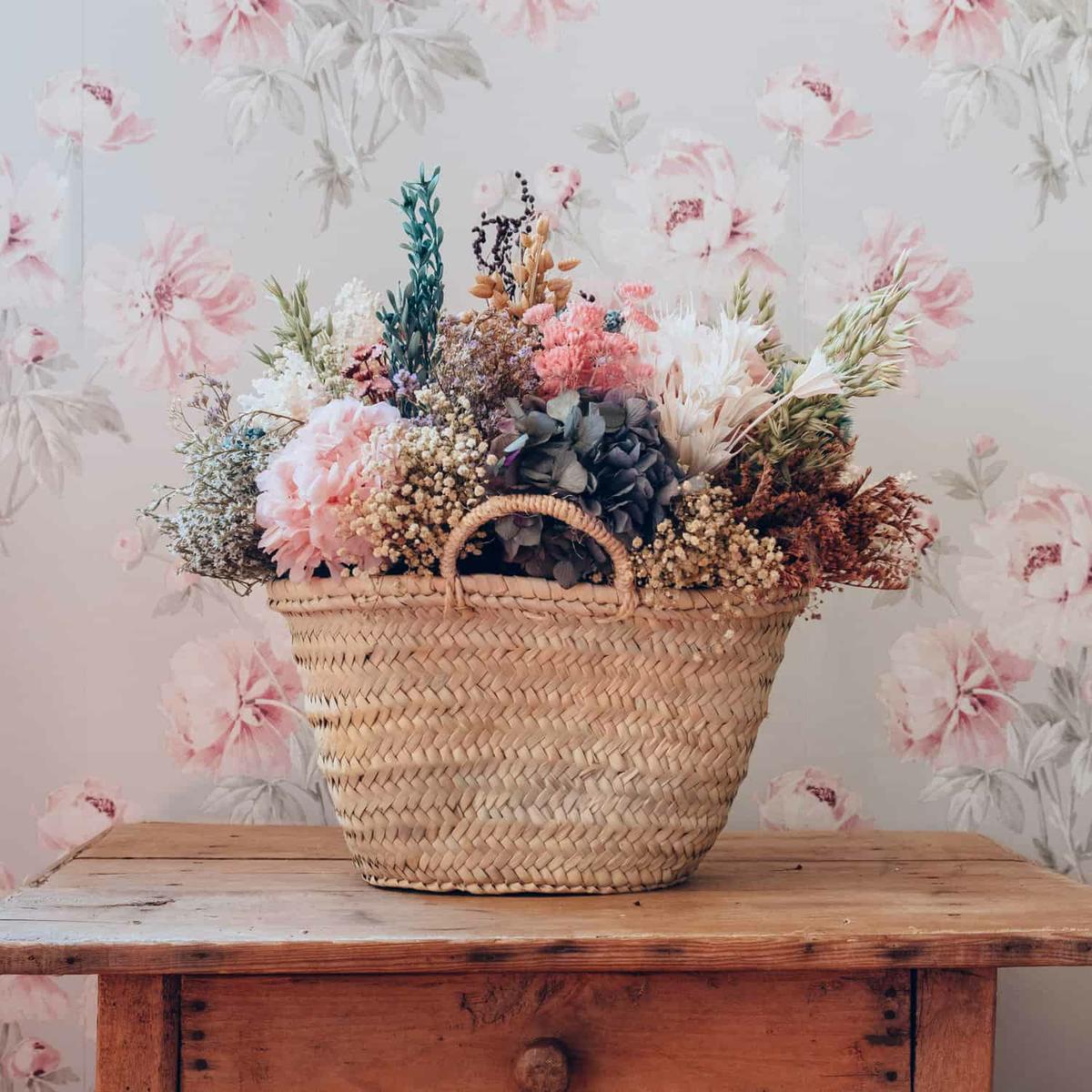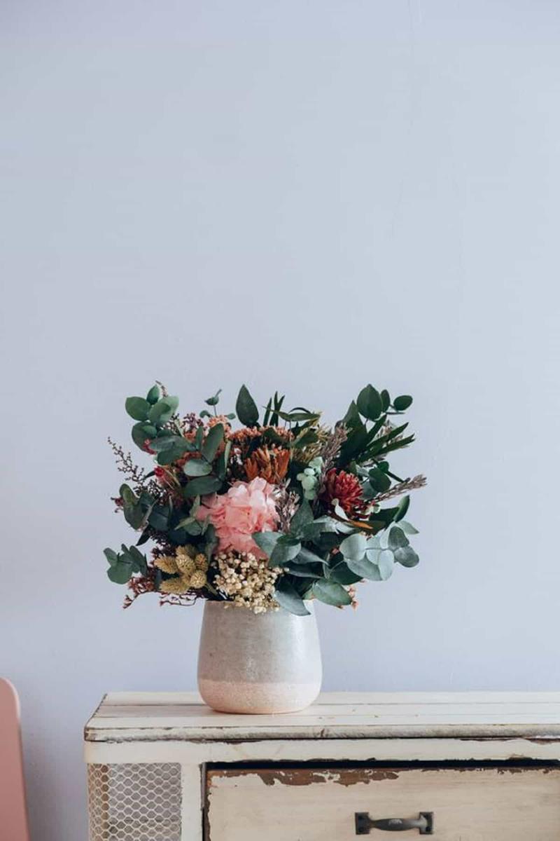 Fuente: floresenelcolumpio Las flores preservadas quedan genial con jarrones antiguas de barro o de latón. Otra solución son los cestos de fibras naturales y de mimbre.