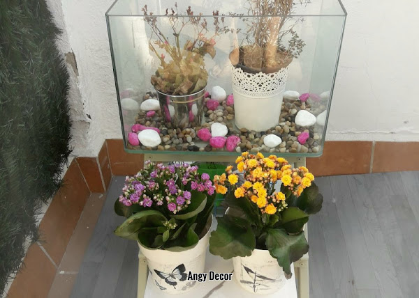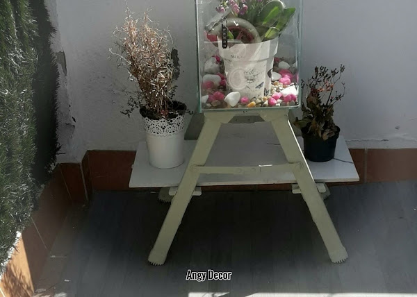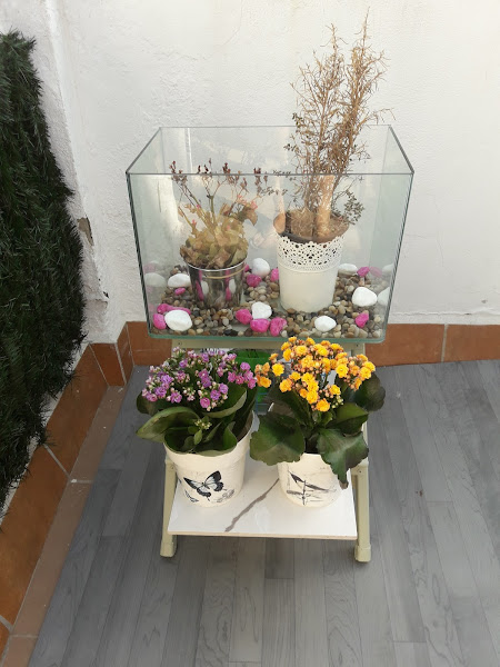 Una vez pintada ha llegado la hora de darle uso asi que he puesto justo encima un pequeño acuario que tenia guardado y le le he metido dentro dos plantas junto a algunas piedras que lo decoran. En los escalones de abajo he colocado una loza que tenia guardada para asi alargar el espacio para poner otras dos macetas. Hay dos posibilidades en la parte baja.