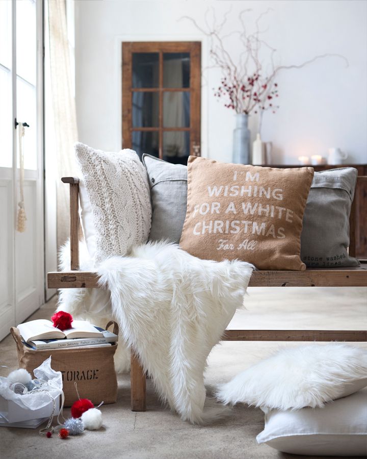Para acompañar a estas mantas y conseguir un look invernal es elegir cojines de colores claros y fríos como blancos, grises o beiges de texturas lisas, de pelo o lana, con ellos crearemos un ambiente acogedor y cálido. Si queremos estampados los más apropiados son de tartán o sencillos como letras o alguna figura de animal, los cuales nos vendrán estupendos para la época navideña.