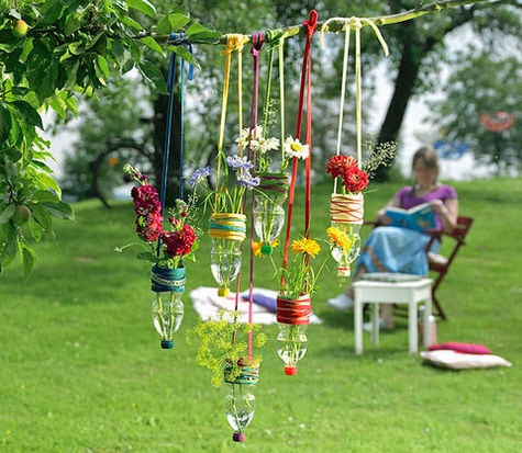 Con botellas de plástico: Recopila diversas botellas y crea distintos diseños. Hazte con cuerdas de colores y abalorios para adornar el conjunto. Añade en el interior tierra (planta unas semillas) o agua con tu flor favorita.