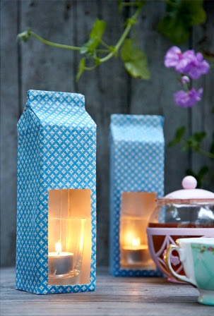 Corta un rectángulo en la parte delantera del envase, cerca del borde inferior, y retíralo. Forra todo el envase a tu gusto. Coloca una vela con base metalizada dentro de un vaso o bote de cristal trasparente (para evitar que se queme el cartón), y éste dentro del envase.