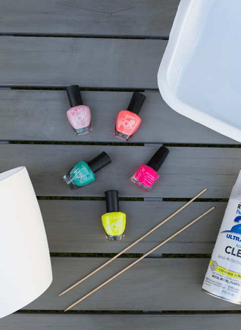 Añadimos los esmaltes (de dos o más colores diferentes) tenemos que conseguir que flote en la superficie del agua, así que con la ayuda de un palillo o pincho de brocheta los mezclamos.