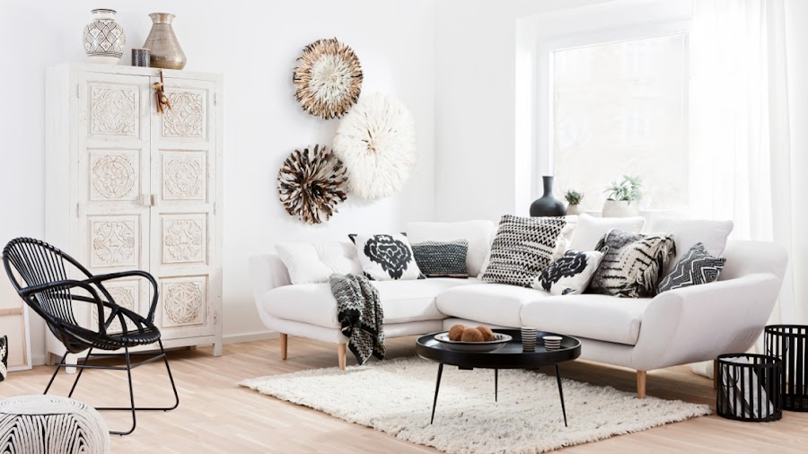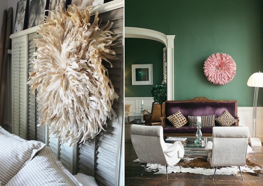 Los rosetones de plumas o JuJu Hats, aunque menos conocidos, son otra opción estupenda y muy original para decorar esas paredes desnudas en las que no sabemos qué poner. Se trata de sombreros artesanos de plumas, elemento estrella de la decoración étnica africana. Con uno solo puede ser más que suficiente, se trata de una pieza que da un toque ligero y en cierto modo acogedor, llenando la pared como si fuera un gran cuadro, y haciendo que esta no necesite nada más.