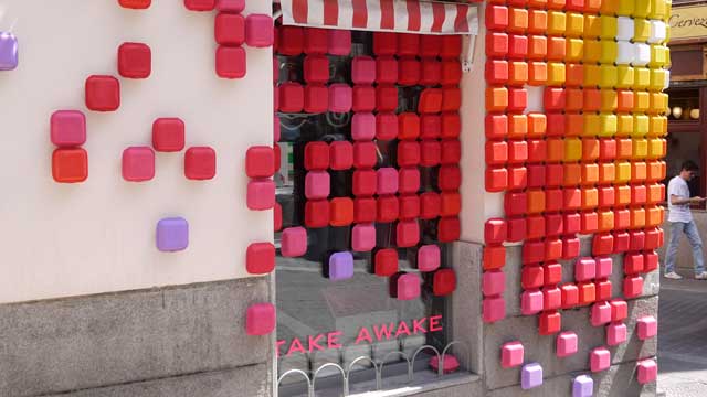 En una hamburguesería, el sol pixelado con cajas de hamburguesas para llevar.