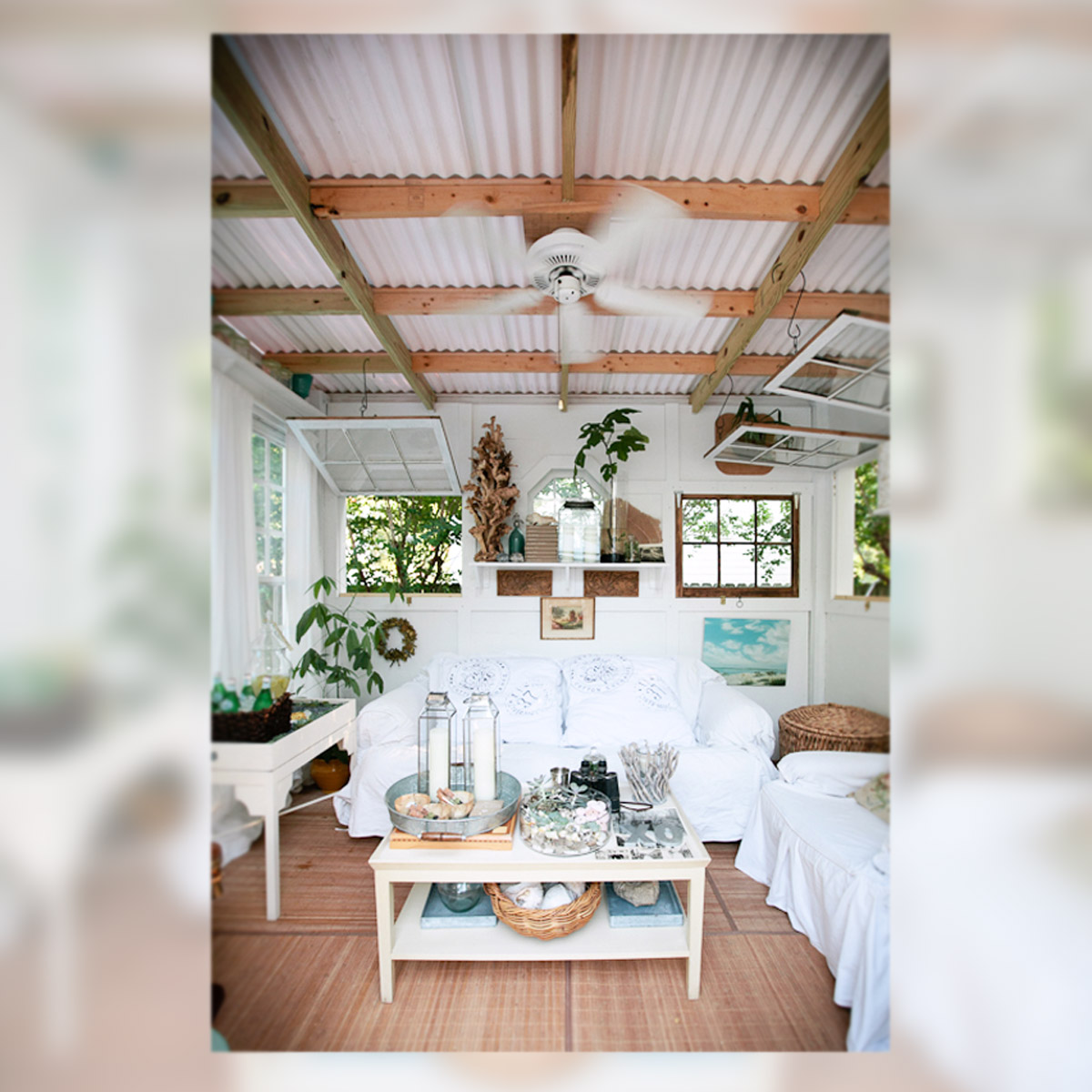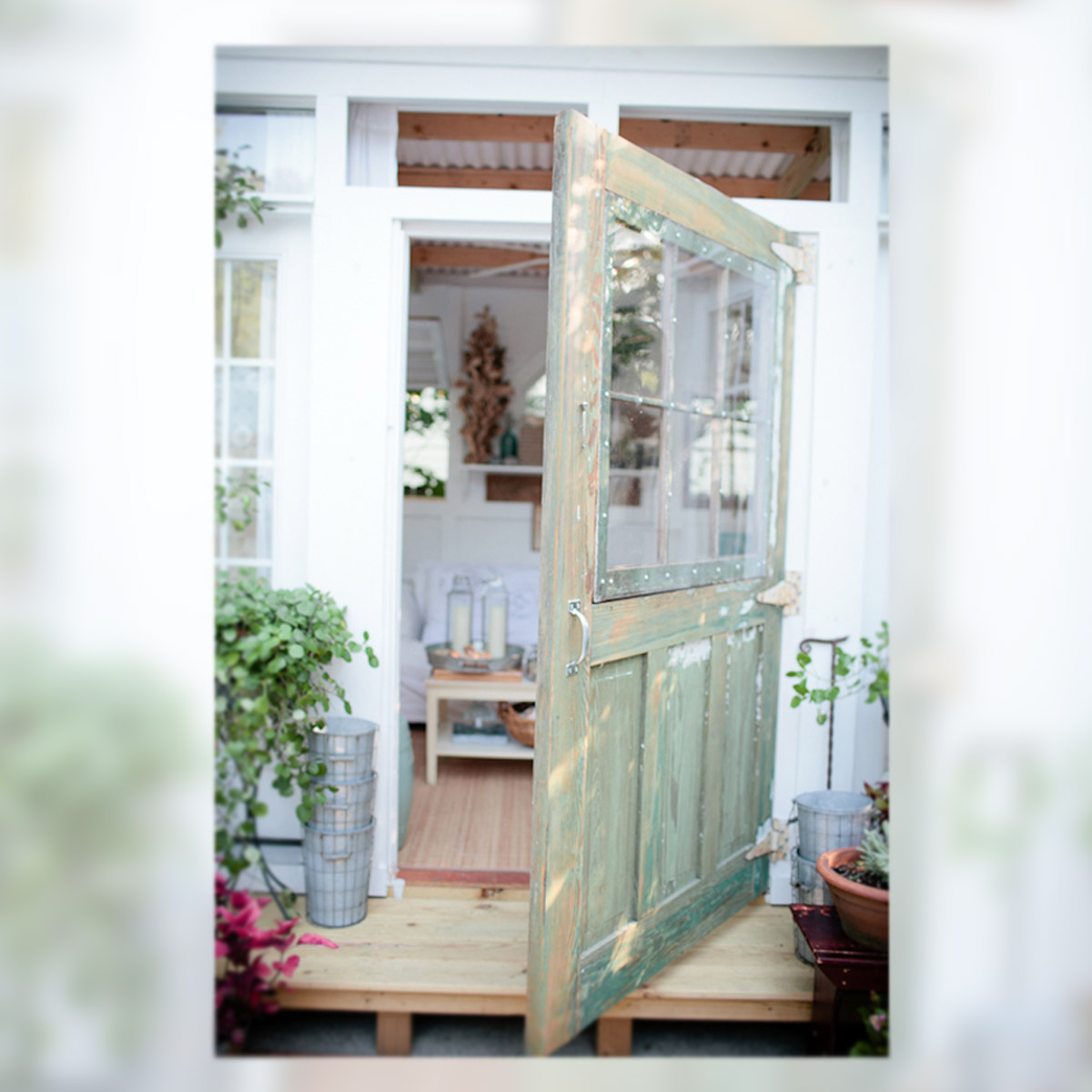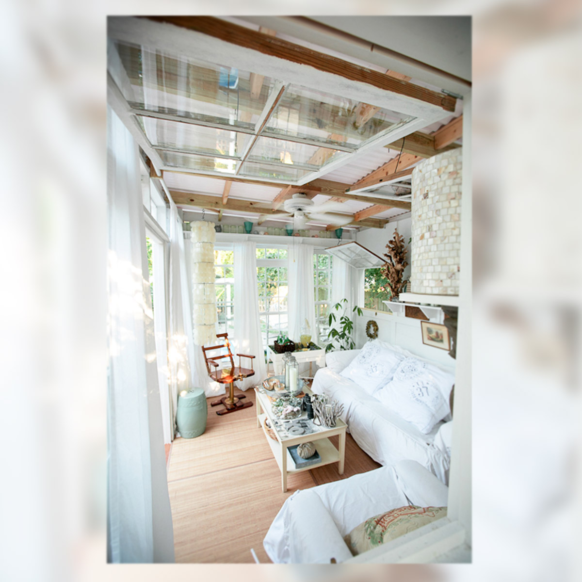 Ventanas y carpinterías reutilizadas, mobiliario outlet, accesorios marítimos y detalles florales dan vida a este original bungalow.