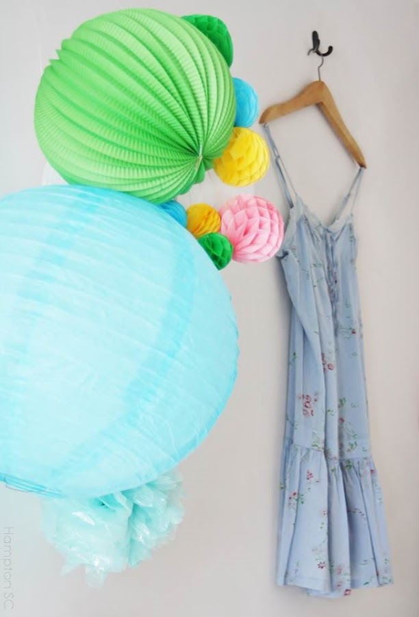 En la pared una composición con pompones-farolillos, un vestido