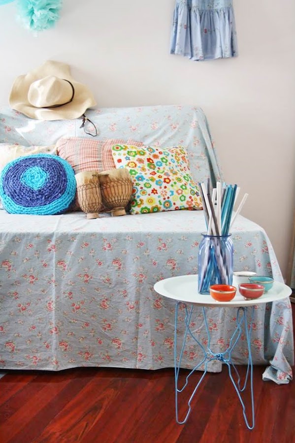 Un plaid para cubrir el sofá, en azul cielo y florecitas, coloridos cojines