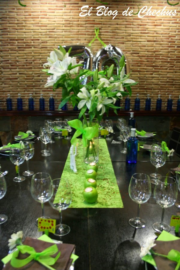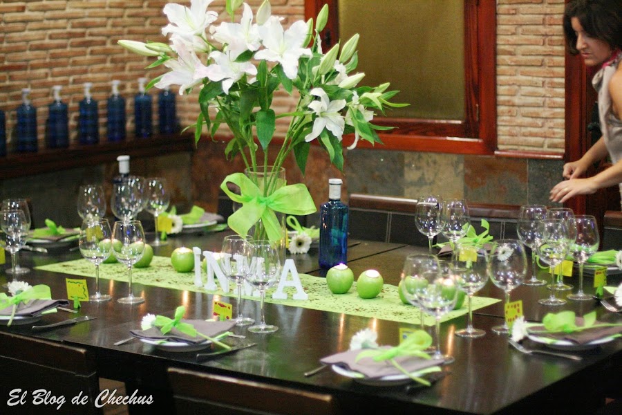 Bueno, os cuento. Lo primero era buscar el color, y verde fue una elección perfecta. Compre un rollo de camino de mesa , a juego con las servilletas de papel, y otro rollo mas fino para poder hacer lazos.