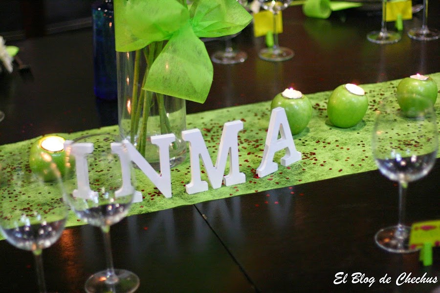 Luego las letras de madera con su nombre y unas manzanas naturales, a las que hice una agujero y puse una vela, fue lo que coloque sobre el camino de mesa. Sobre el había confeti de color rojo en forma de corazones.