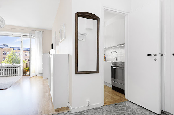 El ejemplo que te proponemos hoy en Minipisos y Espacios Pequeños no va más allá de los 35 m2. Se trata de una vivienda en la que reina el blanco, en la que, aunque cuenta con poco espacio, dispone de un hall de entrada que da acceso al salón-comedor, cocina y cuarto de baño, salón pasante desde el que también se accede al dormitorio y una cocina abierta al dormitorio.