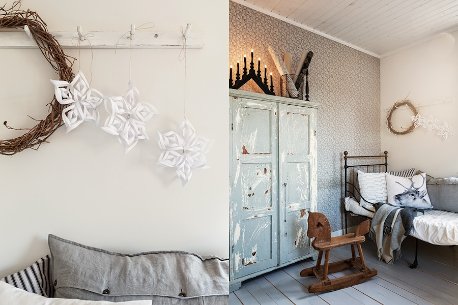 En el dormitorio infantil la decoración navideña es muy delicada, sobre la cama una corona con pequeñas ramitas secas y unos preciosos adornos en papel, unas velas encima del armario....no necesitas mas para crear una perciosa decoración de Navidad.