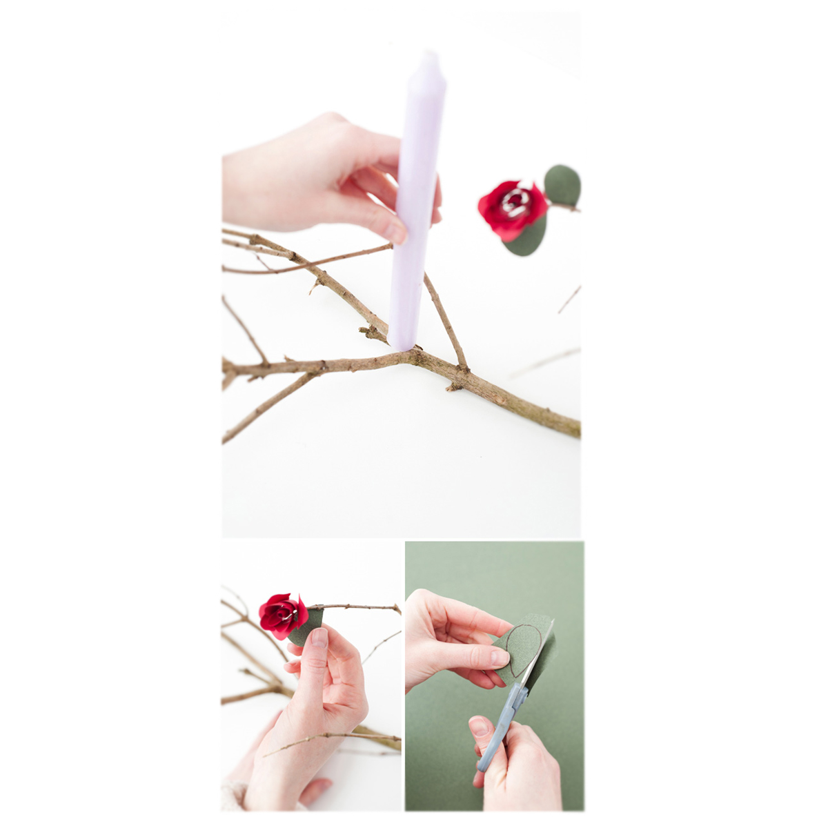 * Trucos: Para un mejor resultado rociar con un poco de spry dorado sobre las ramas. Para una mayor sujeción y seguridad pegar con silicona caliente bases metálicas para velas.