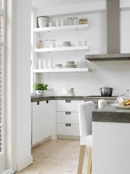 El salón crea una atmósfera suave y acogedora con alfombras y cojines en diferentes tonos de blanco. Sofás sobre ruedas que pueden ser fácilmente corridos de lugar para proporcionar más espacio. Los grandes ventanales adosados son típicos en los hogares holandeses.