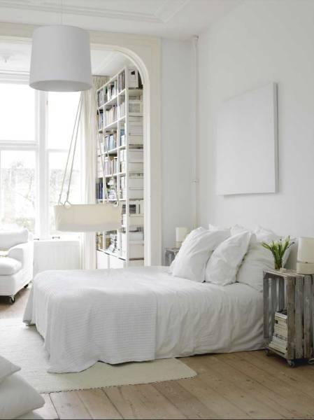 El dormitorio en la primera planta dispone de una superficie generosa. Además de la cama, hay espacio para una biblioteca y unos sillones. Las mesitas de noche están hechas de cajones de manzana, a los que se les han colocado ruedas.