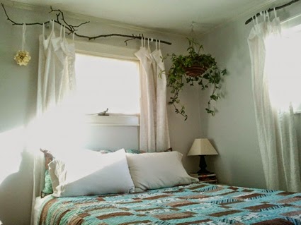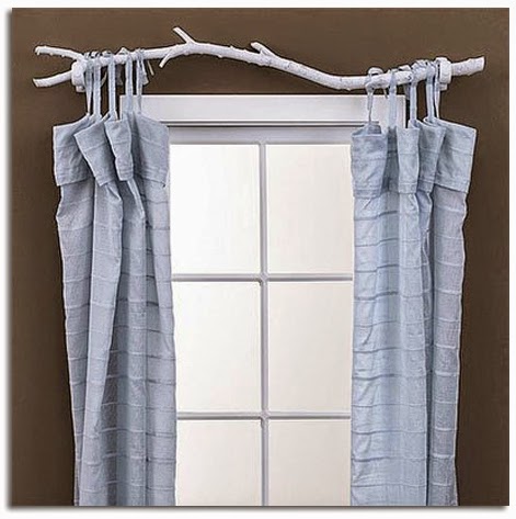 Miramos a continuación, unas ramas como barra de colgar las cortinas, en sus dos versiones, dejándola con su apariencia natural o por ejemplo pintándola de blanco creando contraste con cortinas y pared...