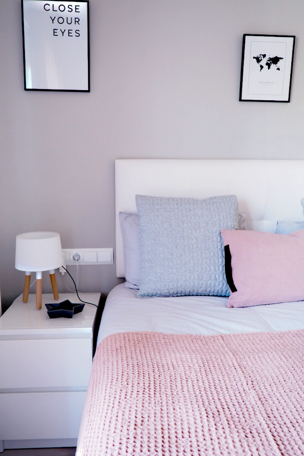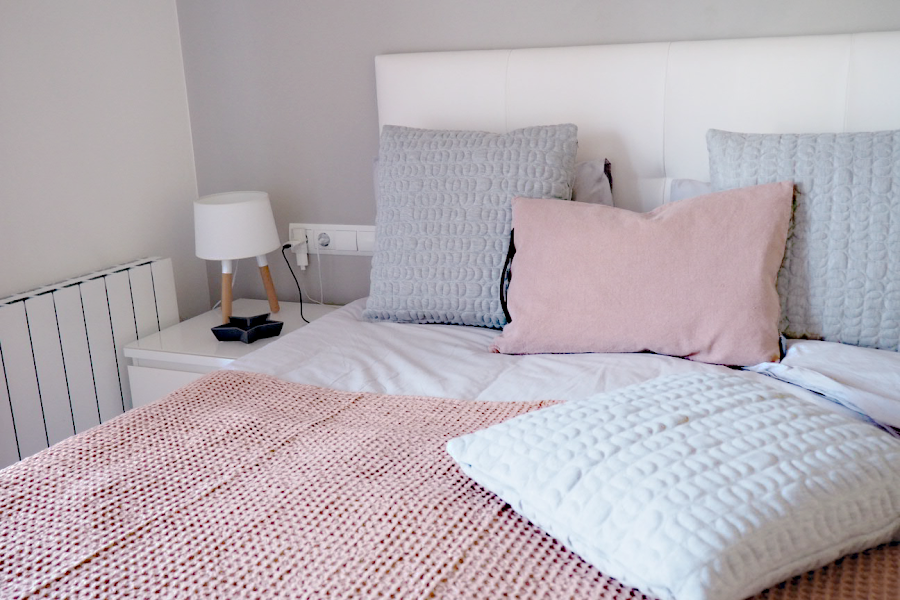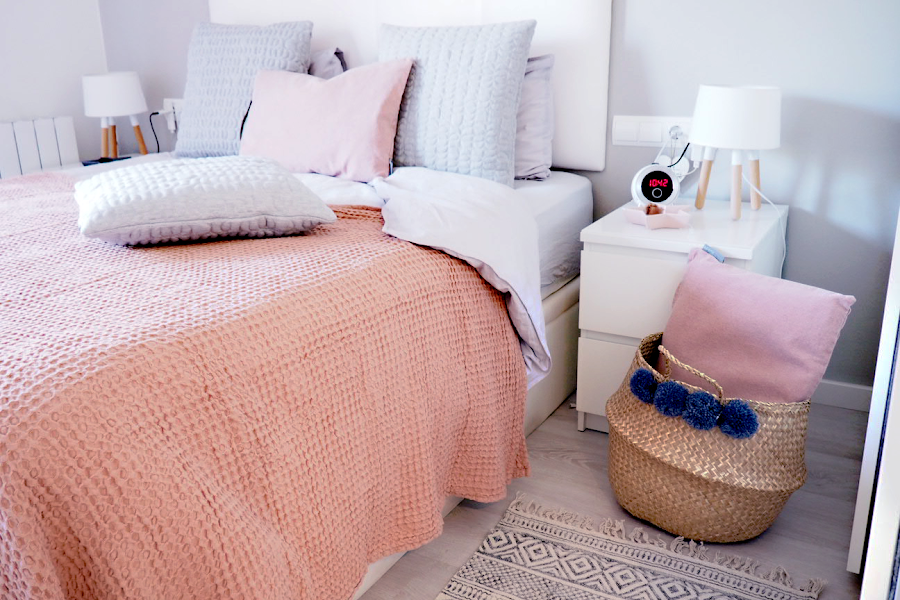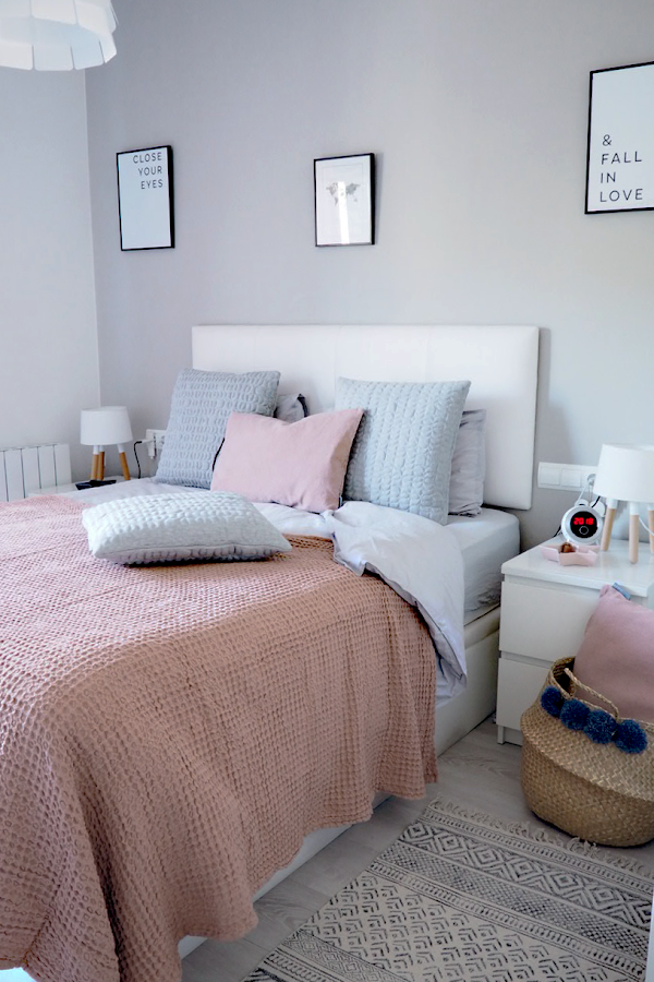 Adoro los tonos neutros en la decoración de un hogar, por eso para esta estancia y para la entrada de la primavera he optado en obtener una buena base neutra con una buena funda nórdica en tono gris para luego poder jugar con todos los textiles en rosa empolvado y ocres y poderlos combinarlos entre si, el detalle del plaid colcha con la textura de gofre hace poder tener un cubre cama en otra tonalidad y darle ese aspecto acogedor.